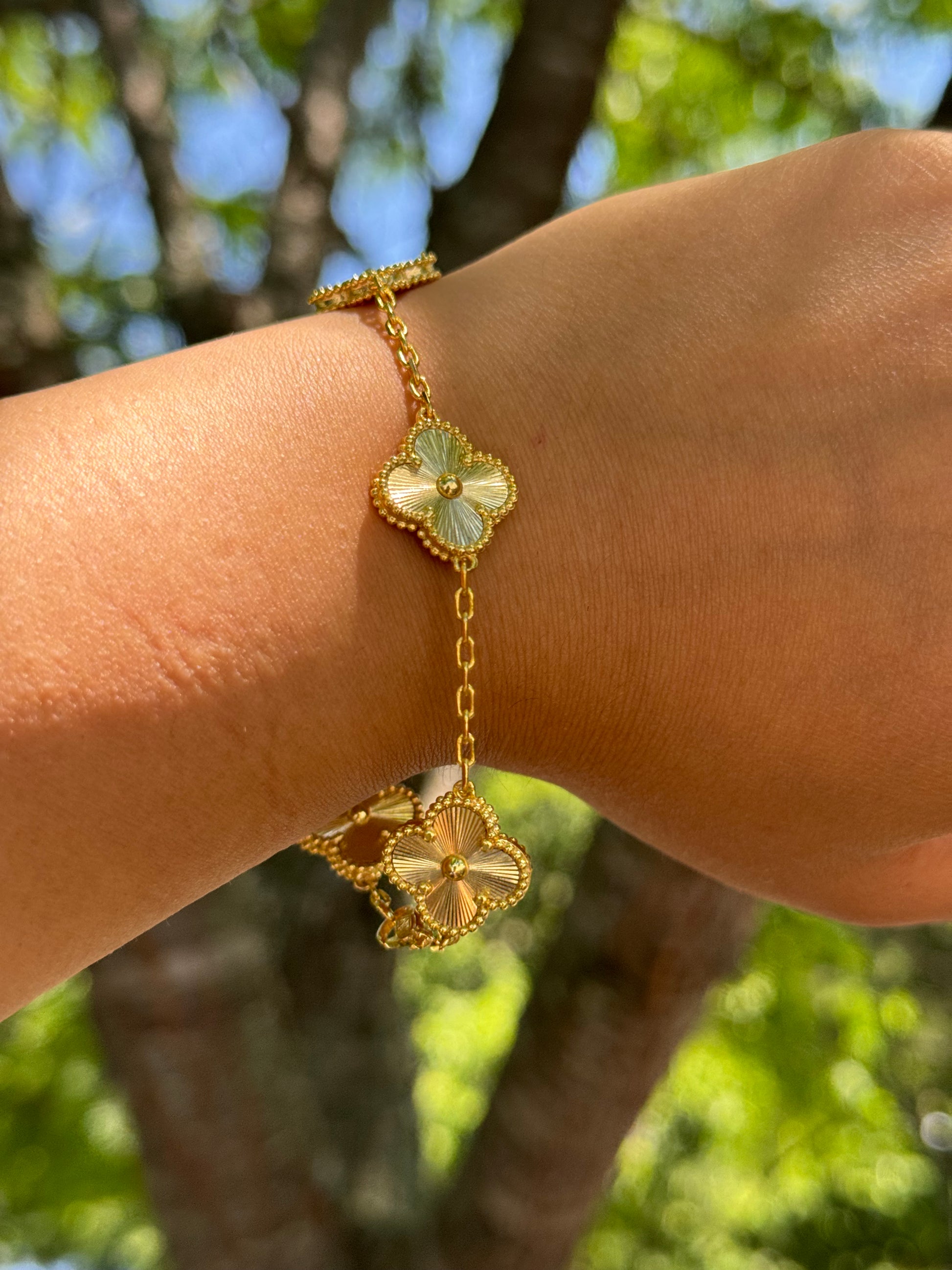 The All Gold Clover Bracelet features a series of four-leaf clover motifs, symbolizing luck and elegance. This bracelet adds a touch of sophistication to any ensemble.