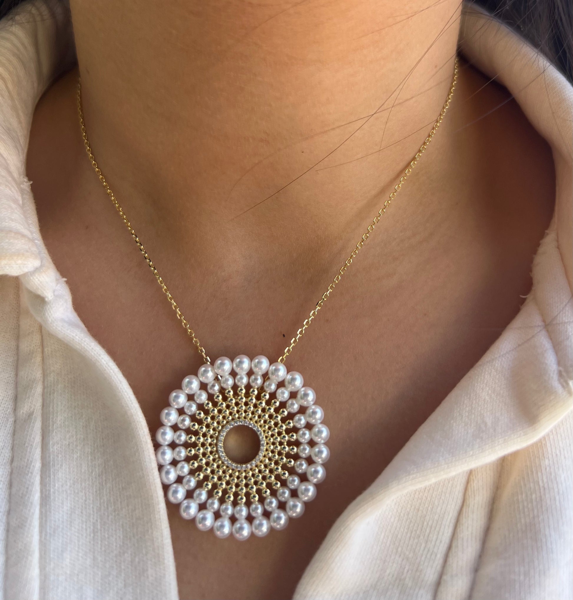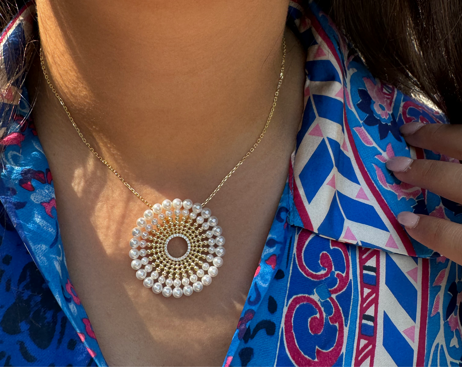 The Bursted Pearl Pendant features a lustrous freshwater pearl surrounded by a burst of sparkling cubic zirconia stones. This pendant creates a timeless, elegant look, perfect for any occasion that calls for sophistication.