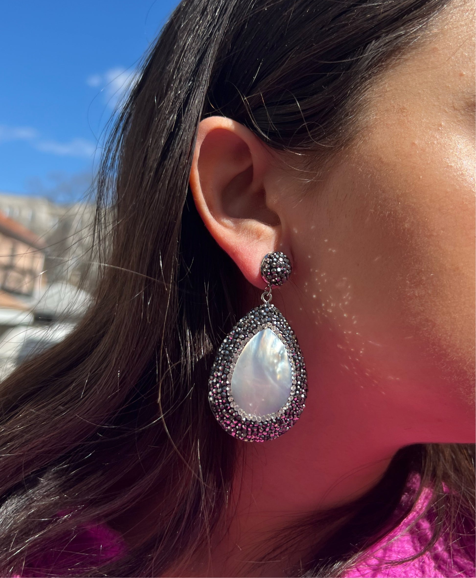 The Pearl x Black Earrings combine elegant freshwater pearls with bold black cubic zirconia stones. This sophisticated design blends classic and modern elements for a timeless and fashionable look.