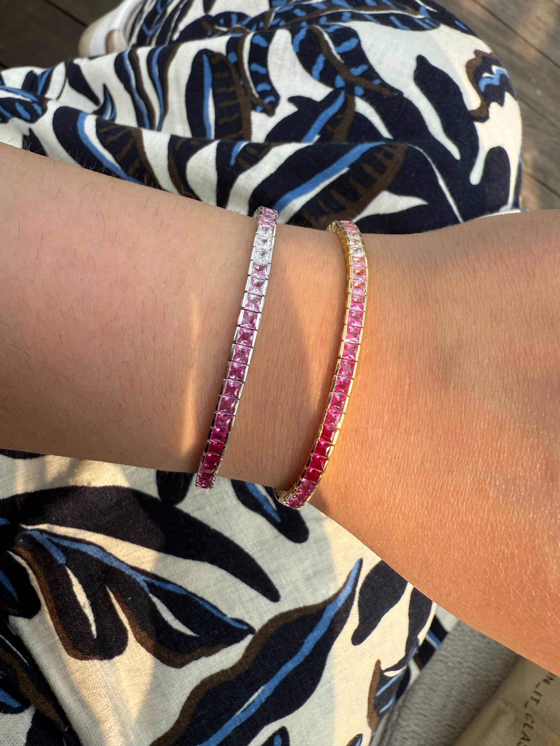 The Pink Ombré Tennis Bracelet features a gradient row of pink cubic zirconia, fading from deep rose to soft blush tones for a stunning color transition. Set in your choice of gold or platinum plating over sterling silver, this bracelet adds a playful yet refined pop of color.